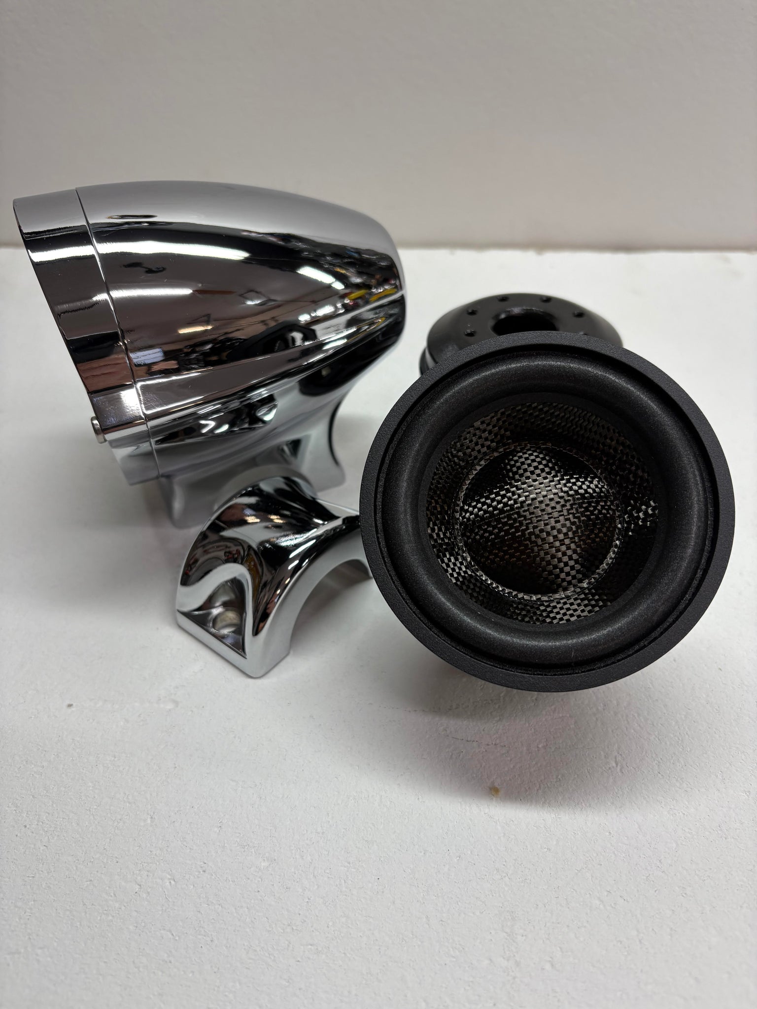 - Mounted low and forward on the engine guard to widen the soundstage and add serious punch