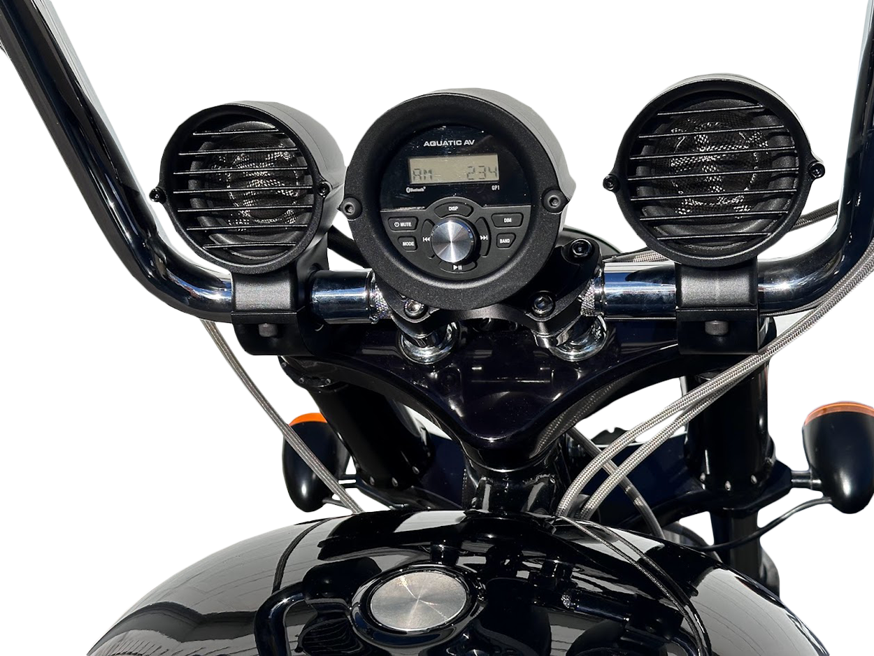 - Works with standard Softail-style handlebars with side-by-side mounting on stock bars, or elevated speaker locations on ape-hangers.